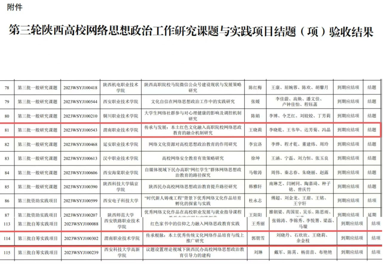 近日,中共陕西省委教育工作委员会公布第三轮陕西高校网络思想政治工作研究课题与实践项目结题(项)验收结果,我校王晓莉副教授主持的研究课题“传承与发展:本土红色文化融入高职院校网络思政教育的融合机制研究”、郭朋雪老师主持的自筹实践项目 “传承根脉:本土优秀传统文化网络作品培育与线上推广研究”均顺利通过验收,成功结题(项)。