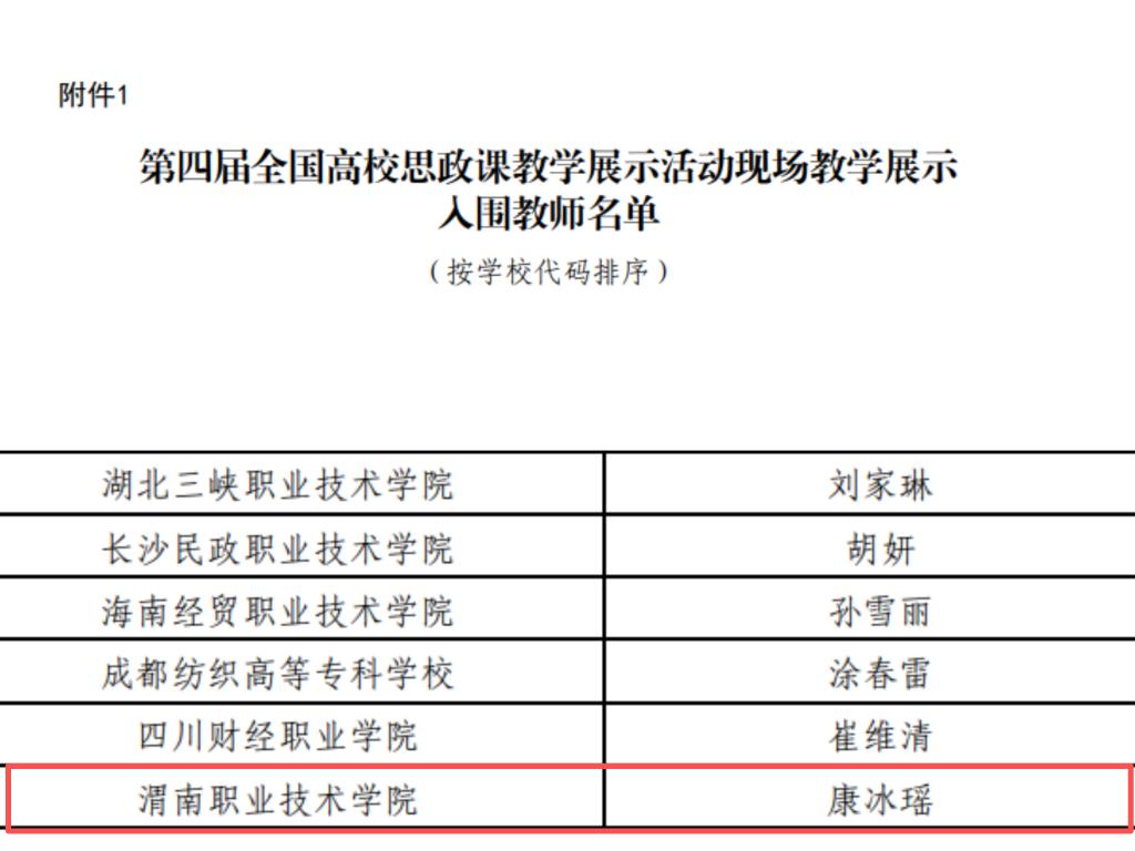 近日,教育部社会科学司公布第四届全国高校思政课教学展示活动现场教学展示入围名单,我校马克思主义学院康冰瑶老师成功入选高职高专组“形势与政策”课程展示名单。全省高职院校仅有两所学校入围,我校成功入选。